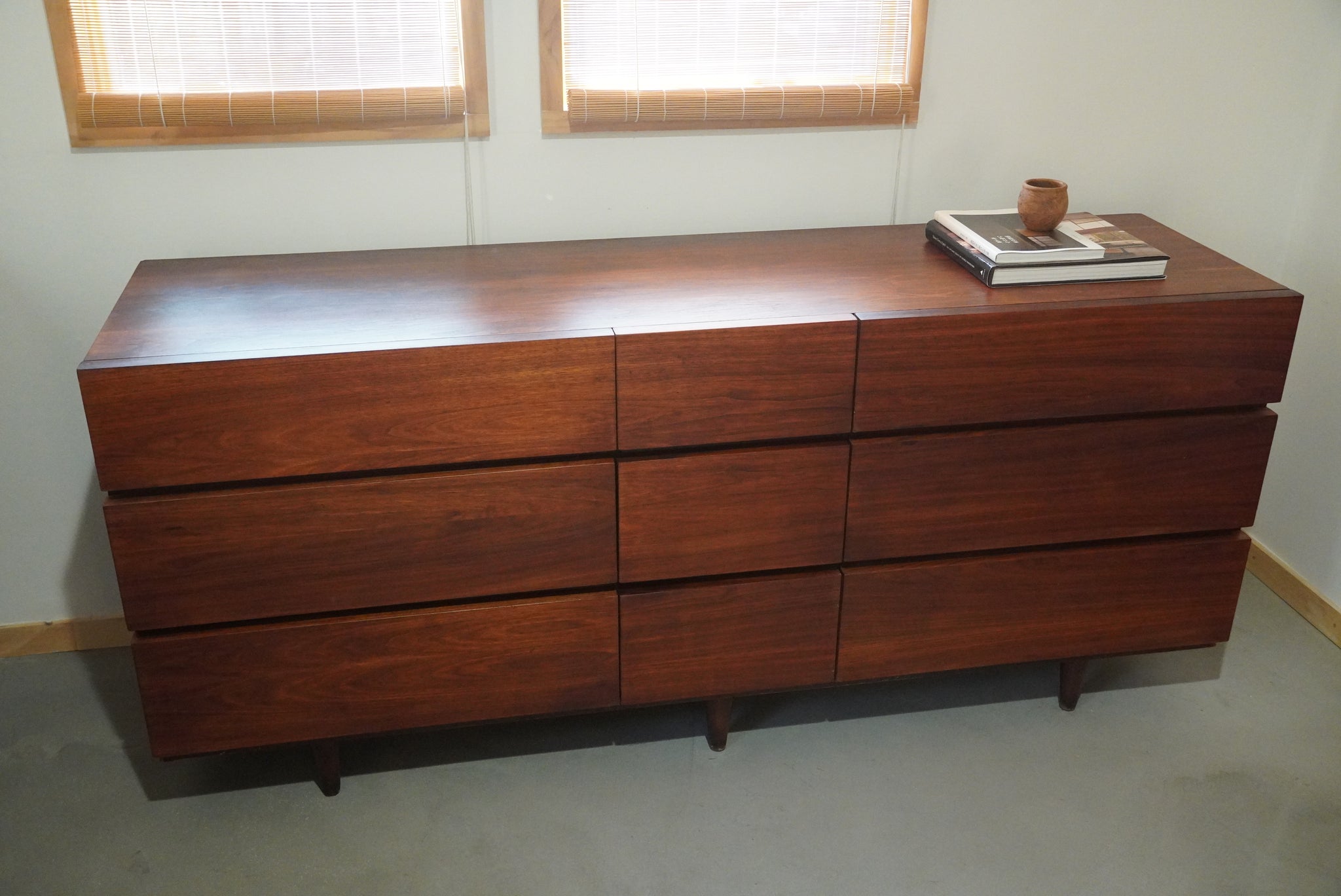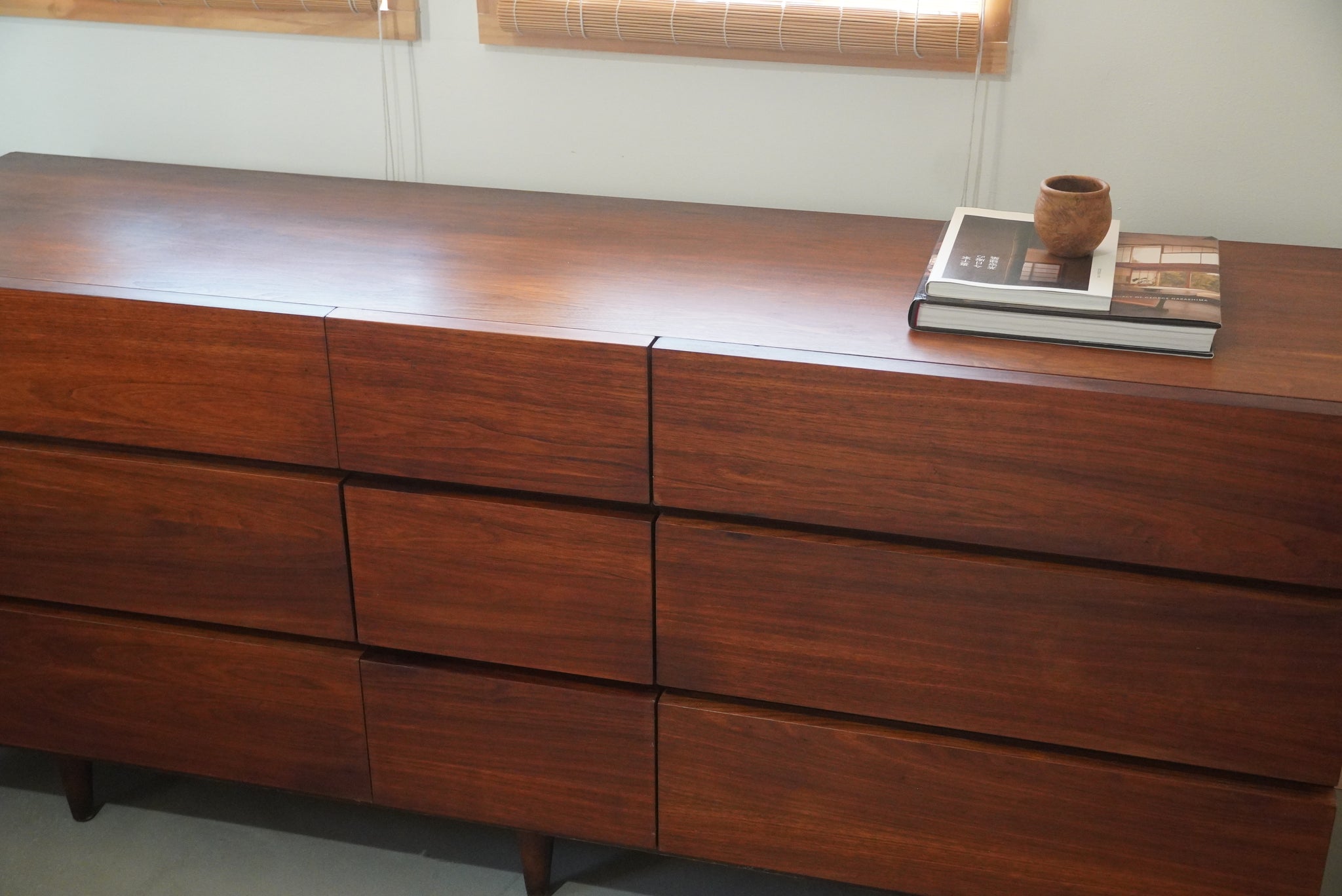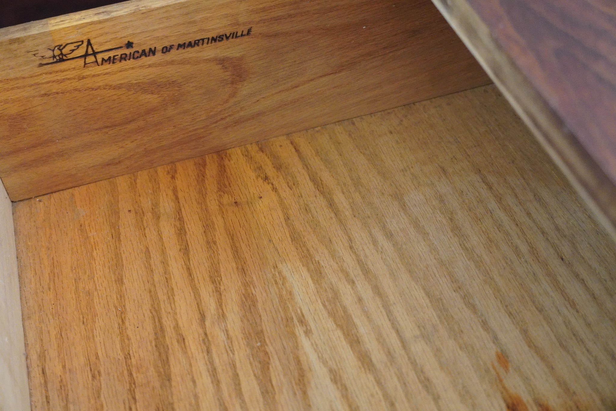 Minimalist American of Martinsville wood credenza. Lovely piece, it has been carefully refinished with a tung oil finish. Great sturdy piece that can match almost any aesthetic.